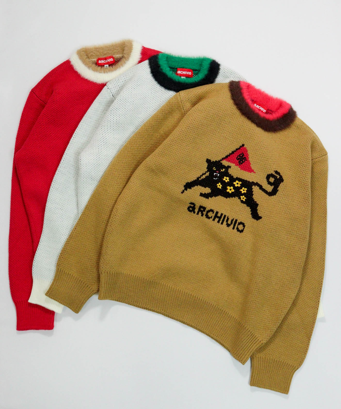 フラッグを掲げたシルエットと花の刺繍が印象的な、遊び心をくすぐるニットは、襟ぐりのシャギーヤーンがふわりと輝き、