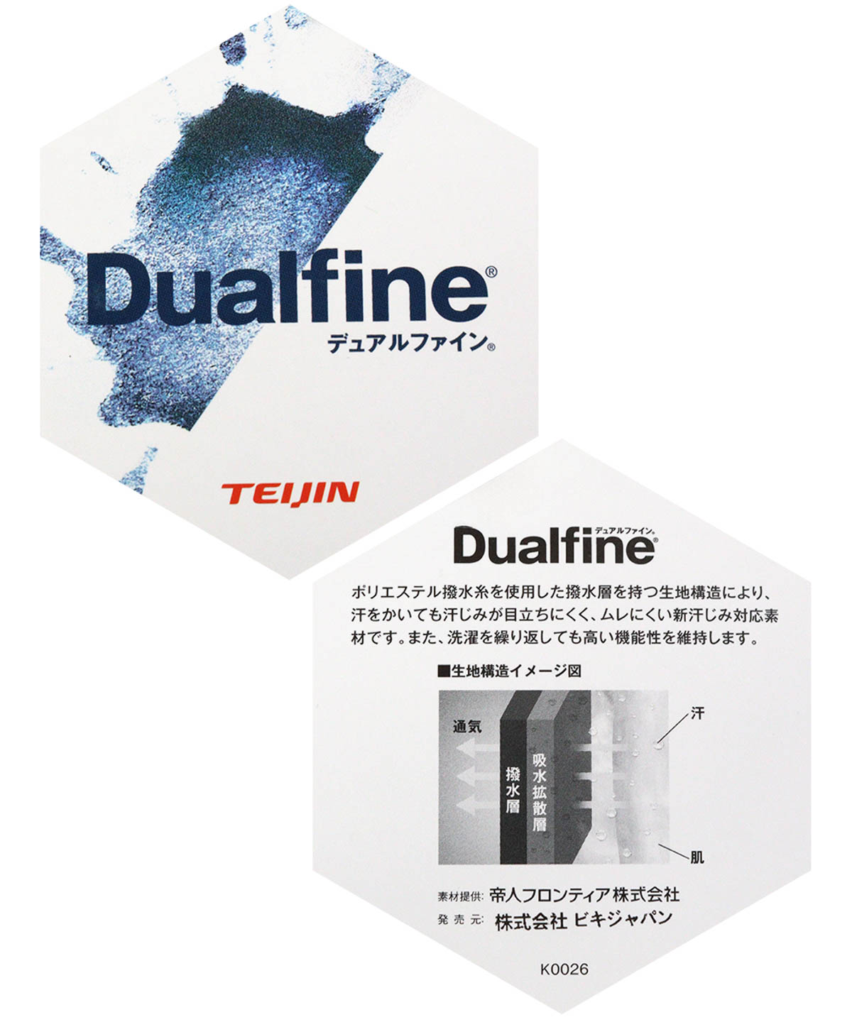 ポリエステル撥水糸を使用した撥水層を持つ生地構造により、汗をかいても汗じみが目立ちにくく、ムレにくい新汗じみ対策素材です。