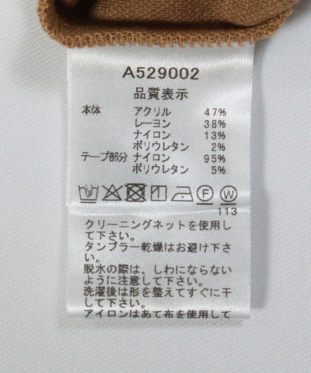 本体:アクリル47%,レーヨン38%,ナイロン13%,ポリウレタン2%