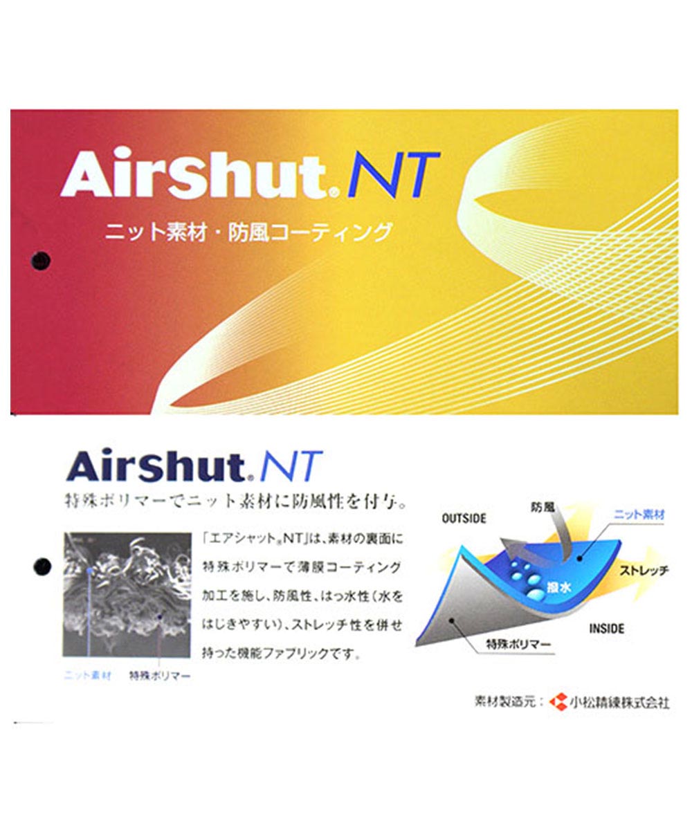 エアシャットNTは素材の裏面に特殊ポリマーで薄膜コーティング加工を施し、防風性、はっ水性(水をはじきやすい)、ストレッチ性を併せ持った機能ファブリックです。