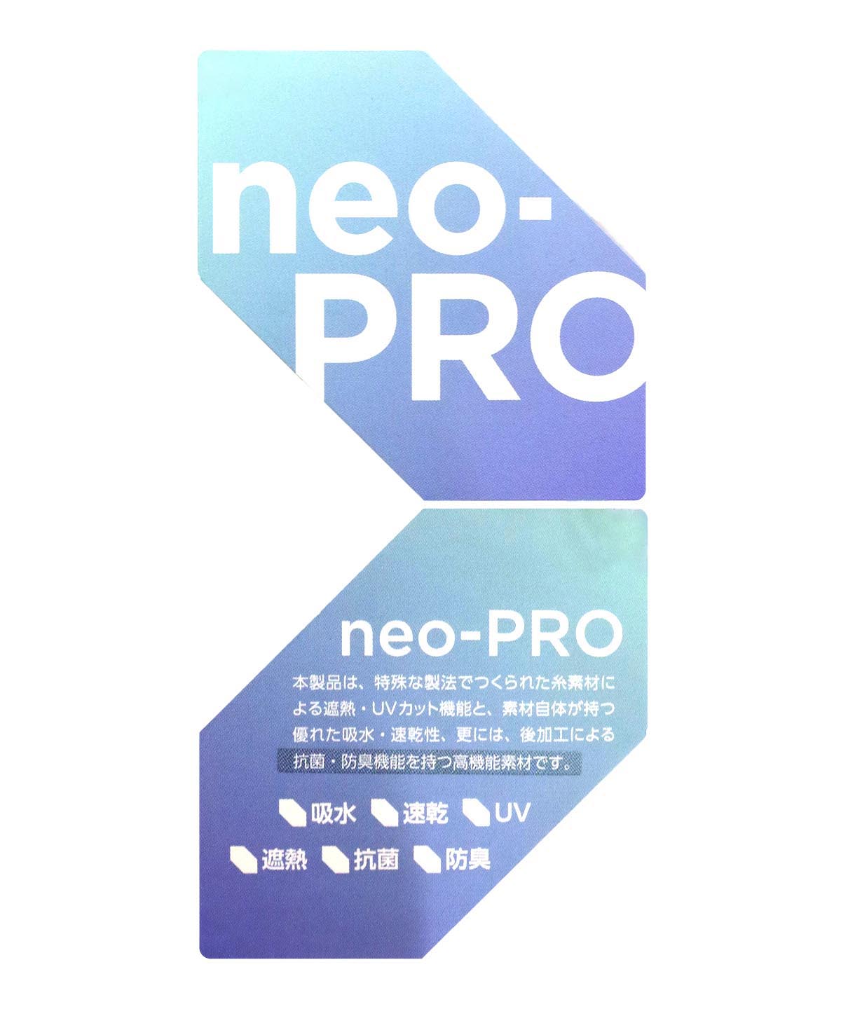 neo-PROは、特殊な製法でつくられた糸素材による遮熱・UVカット機能と、素材自体が持つ優れた吸水・速乾性、更には、後加工による抗菌・防臭機能を持つ高機能素材です。