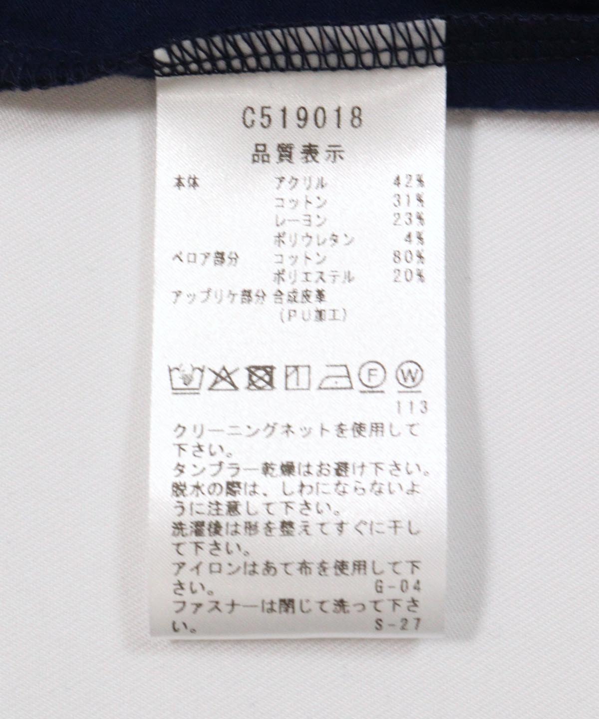 本体:アクリル42%,コットン31%,レーヨン23%,ポリウレタン4%