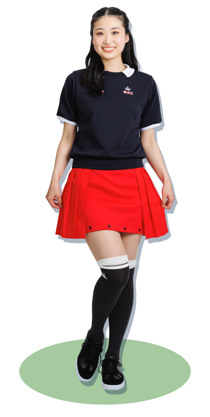 グリーンに映える、定番の紺×赤カラーコーディネート。